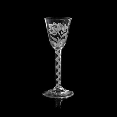 the round funnel bowl engraved with a six petal flower and a moth to the reverse, raised on an opaque twist stem, over a round conical foot