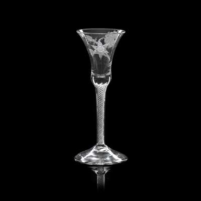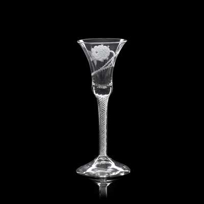 the bell shaped bowl with engraved rose head and bud, the reverse with a stylised star with a rose head within, raised on an air twist stem and conical circular foot