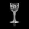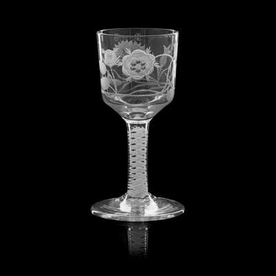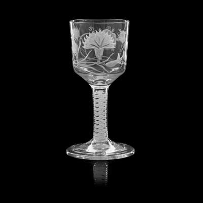 the generous ogee bowl engraved with a six petal rose, an open bud and a closed bud, and to the reverse with a carnation with buds, raised on a multi-spiral opaque twist stem and a round conical foot