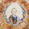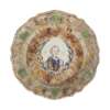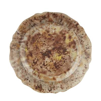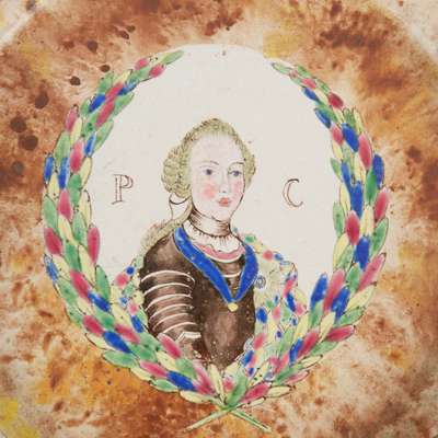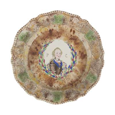 with partial Wheildon-type glaze, of scalloped form, the press moulded border with basket weave and flower head designs within a gadrooned rim, painted to the centre with a portrait of Bonnie Prince Charlie wearing a harlequin cloak, flanked to either side by the initials P and C, within a brightly enamelled laurel wreath border
