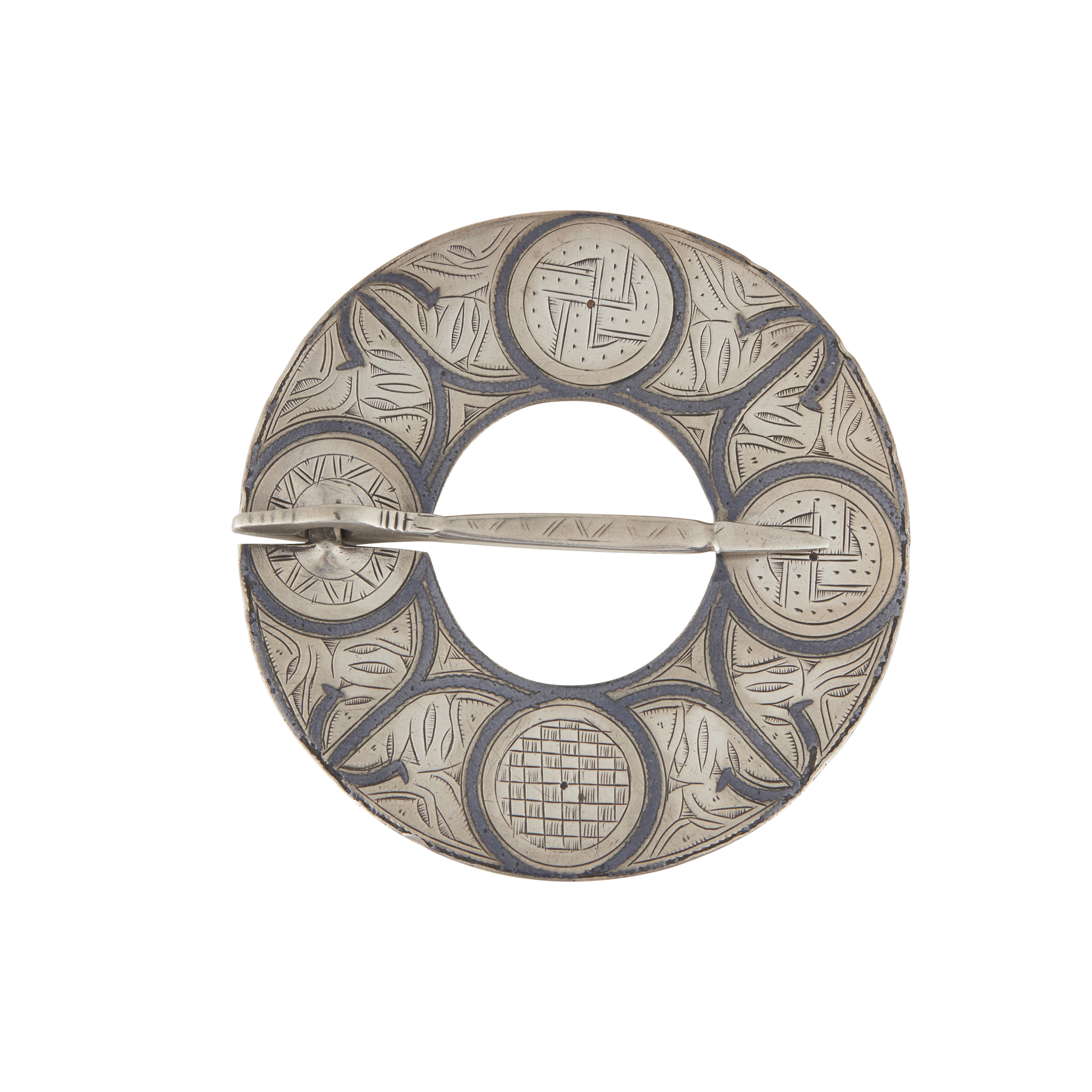 the annular brooch with engraved Celtic bosses and interlace, with black niello enamel borders and decoration, with integral swing pin, the reverse engraved DD, IC, 1760