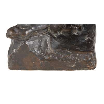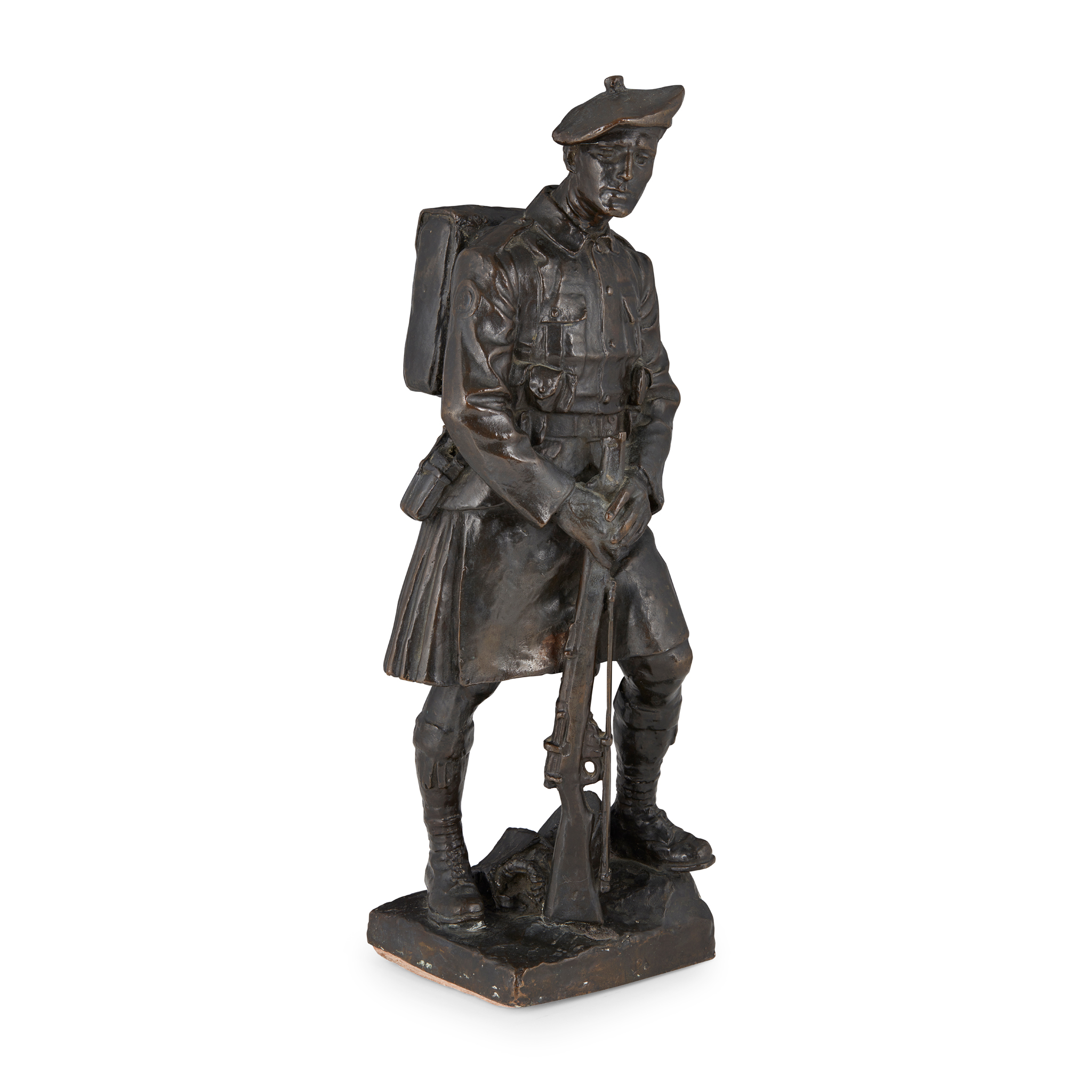 bronze, dark brown patina, cast as a Highland soldier in full uniform, on a square naturalistic base, inscribed ‘G.H. Paulin, 1924’