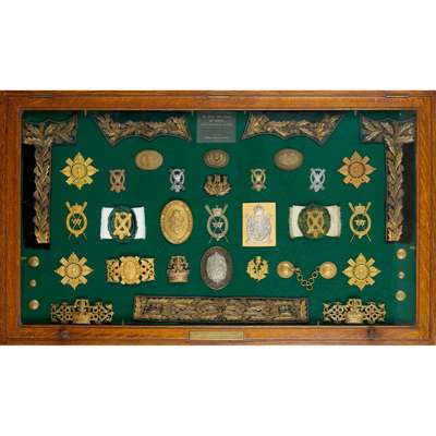 the oak frame with green velvet back board, applied with insignia of the King's bodyguard of Scotland, to include cap badges, cross belt plate, waist buckle and buttons etc, the frame with brass plaque, inscribed 'presented to the Officer's Mess Bramley by Mrs. Egan, in memory of the late CCL.M.H. Egan, CMG, CBE'