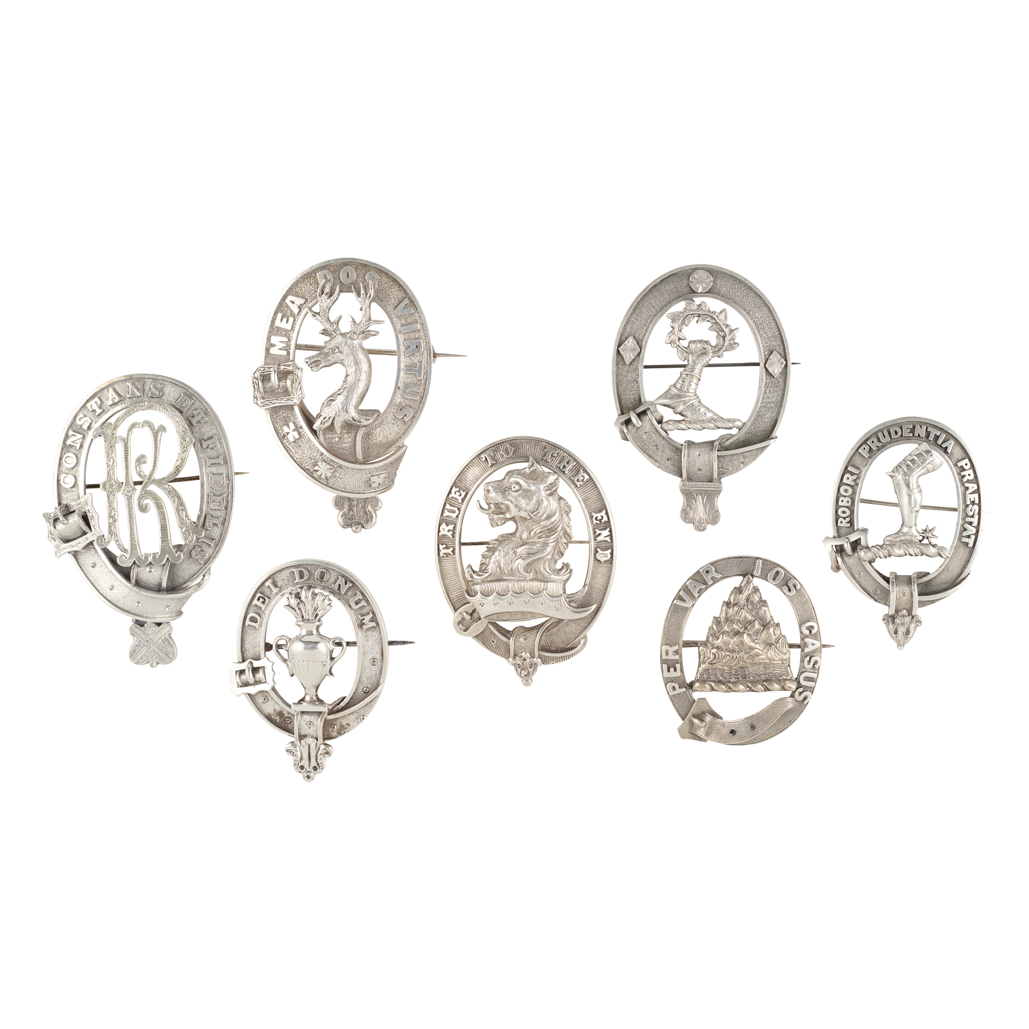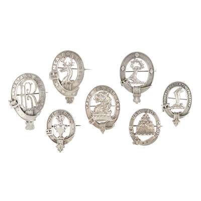 modelled with a pot of lilies with the motto DEI DONUM, unmarked; together with a collection of six other clan cap badges, unmarked