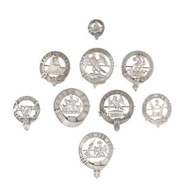 unmarked; together with a clan cap badge for Clan Grant, Clan Patton and Clan Macleod, all unmarked; together with four clan cap badges, unmarked and one for Clan Johnstone, Glasgow 1945 (9)