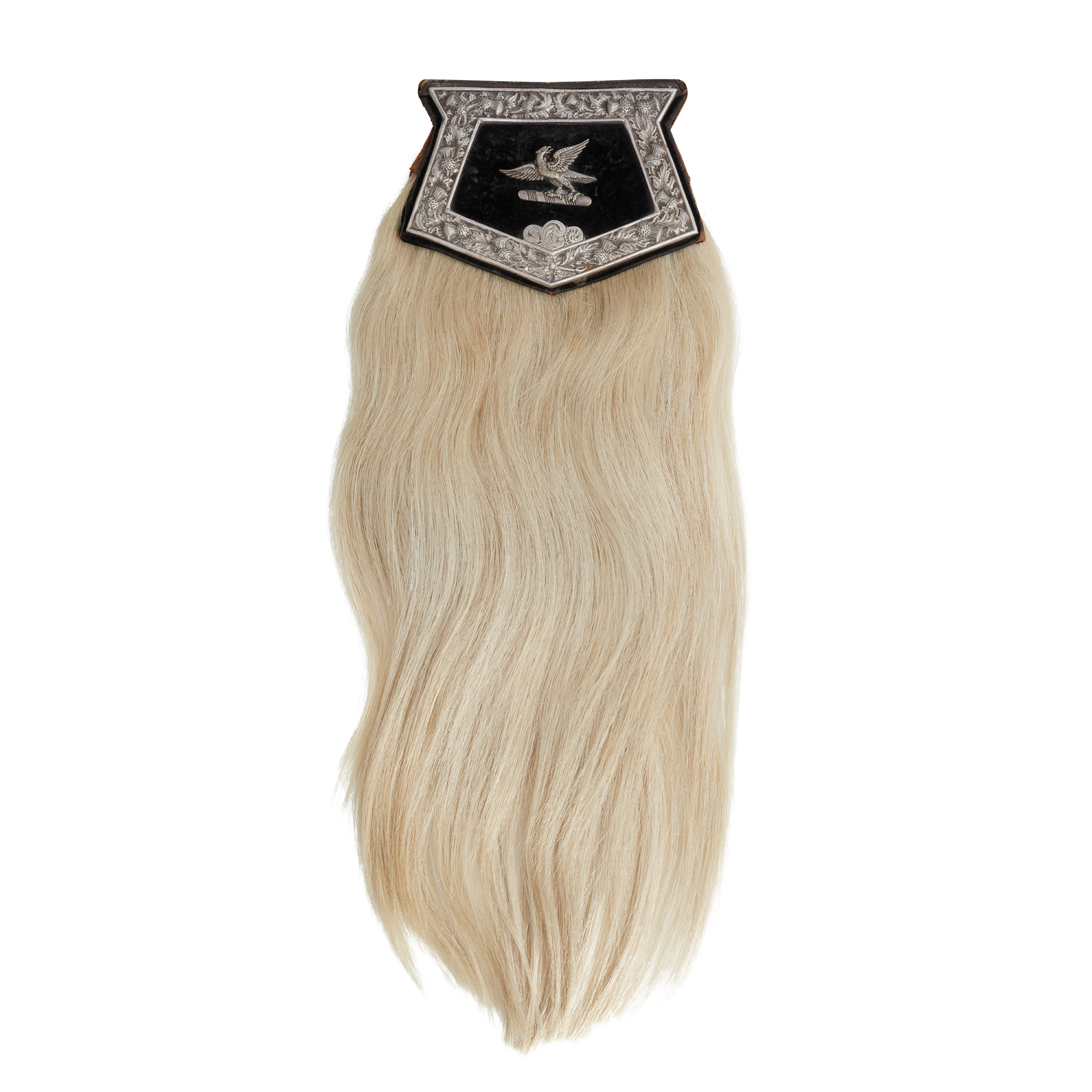 the cantle of black velvet with applied unmarked silver thistle border and heraldic eagle applique, with a long white horse hair body with a red leather reverse