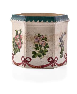 glazed earthenware, painted to the facetted sides with sprays of daisies, corydalis, bluebells, dog roses, white clover and forget-me-nots and bearing inscriptions INNOCENCE, RESOLUTION, SUBMISSION, SIMPLICITY, THINK OF ME, AND TRUE LOVE, impressed maker's mark WEMYSS WARE/ R.H.& S, printed Thomas Goode & Co. retailer's mark