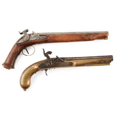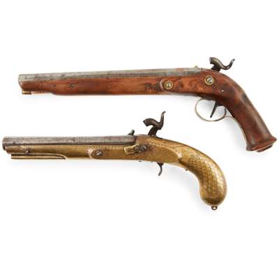 probably made for the Scottish market, the all brass stock and butt with engraved chequering and foliate decoration with octagonal steel barrel and simple percussion lock, 34cm long, barrel 20.5cm; together with a 19th century Continental percussion pistol (2)