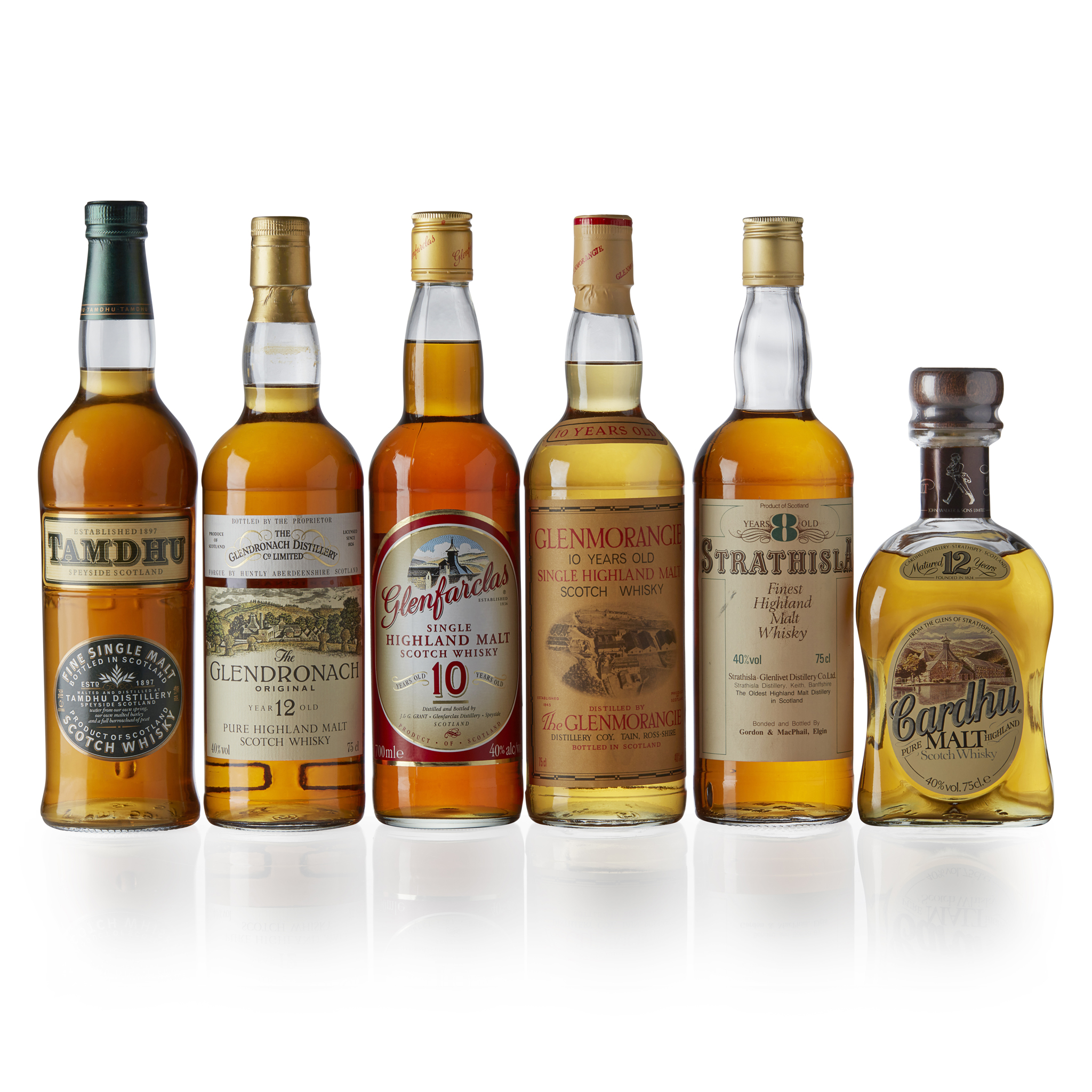 with carton 70cl / 40%; Glendronach 12 year old with carton 75cl / 40%; Glenfarclas 10 year old with tin 700ml / 40%; Glenmorangie 10 year old with carton 75c / 40%; Strathisla 8 year old, Gordon & MacPhail 75cl / 40%; Cardhu 12 year old with box 75cl / 40% (5)