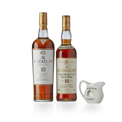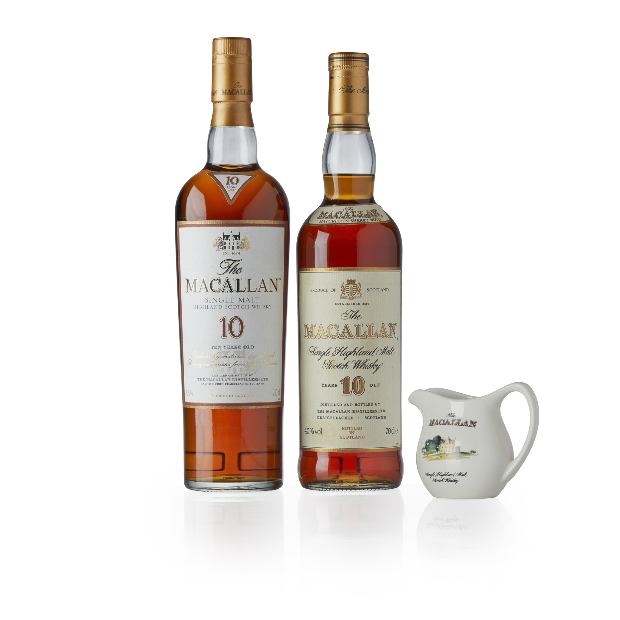in carton with ceramic water jug, 70cl / 40%; together with Macallan 10 year old (2000s) with carton 700ml / 40%