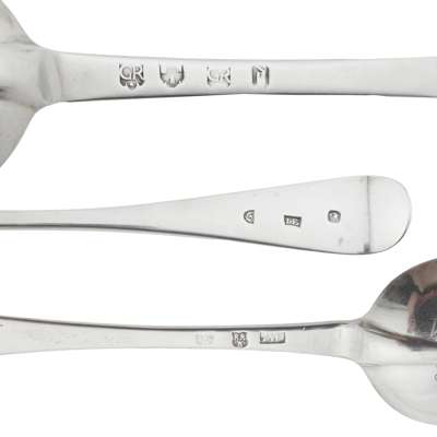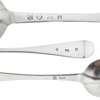 to include a Hanoverian pattern example with rat tail by Alexander Forbes marked AF, three towers, rose head; an Old English pattern example by James Erskine marked thistle, IE, cockerel and a Fiddle pattern (converted from Hanoverian) by George Robertson marked GR, three towers, GR, gothic A (3)