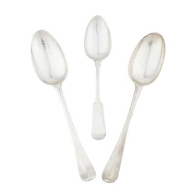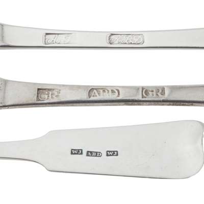 marked GR, ABD, GR, of Hanoverian pattern with facetted heel and engraved R*B*A / 6 to terminal; together with a Hanoverian pattern tablespoon by A Thomson marked AT ABD (in script) and a dessert spoon Fiddle pattern by W Jamieson marked WJ, ABD, WJ (3)