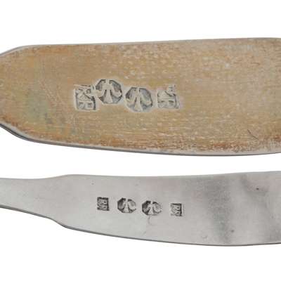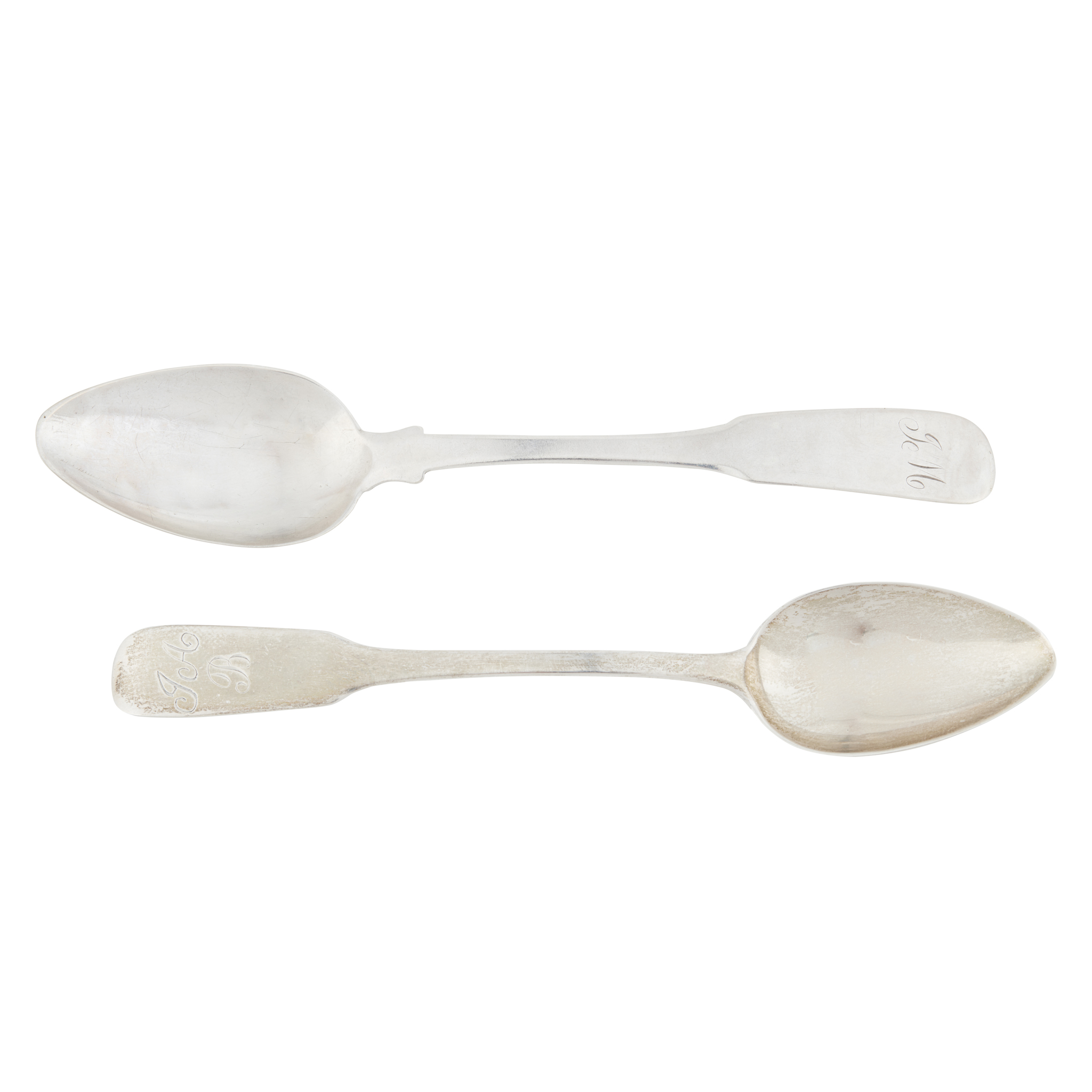 marked RR, fleur de Lis twice, RR, one of Fiddle pattern the other Oar pattern, each with engraved initials to terminal (2)
