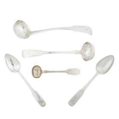 to include Fiddle pattern toddy ladle, J Halliday; Fiddle pattern toddy ladle M Hinchscliffe; Fiddle pattern teaspoons by D Ray and H Mouncie and a salt spoon by Adam Burgess (5)