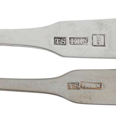 marked TS, Eln, Cathedral, of Fiddle and Shell pattern with gothic initial D to terminal; together with a teaspoon of the pattern marked TS, Eln (2)