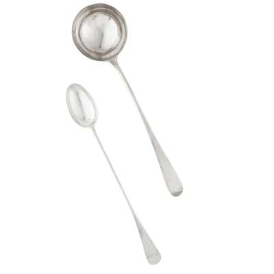 marked IMcE, town mark, IMcE, S, of early Old English pattern with twin foliate script initials to terminal and deep circular bowl; together with a long Old English gravy spoon by Adam Graham of Glasgow marked, town mark, AG, town mark with vacant terminal (2)