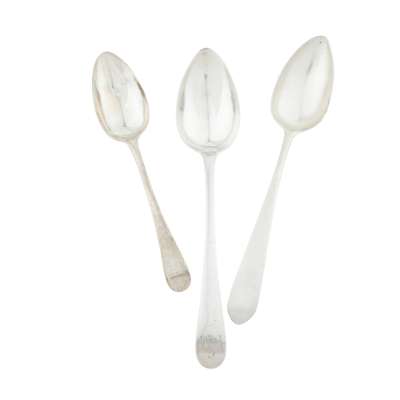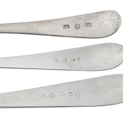 marked IB, anchor, IB of Old English pattern with engraved initials to terminal; together with an Old English pattern tablespoon by A Campbell marked AC, ship, anchor, ship and a Celtic Point pattern example by T Davie marked TD, anchor, ship, C, oak tree (3)