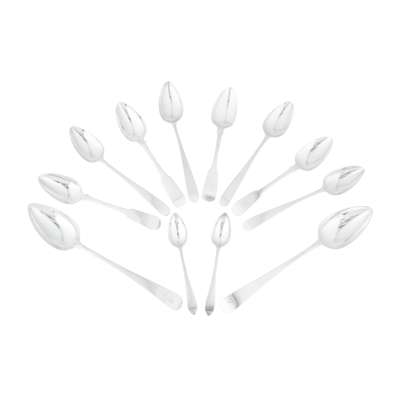 to include a pair of tablespoons, marked TD, anchor, ship, C, tree, of Old English pattern with script initial B to terminal; four dessert spoons, marked TD, ship, C, tree, of Old English pattern and two teaspoons, marked TD, anchor, tree, of Celtic Point pattern; together with a pair of dessert spoons, Alex Cameron, Dundee, Edinburgh 1822, and a pair of dessert spoons, William Cummings, Dublin 1825, of Fiddle pattern (12)