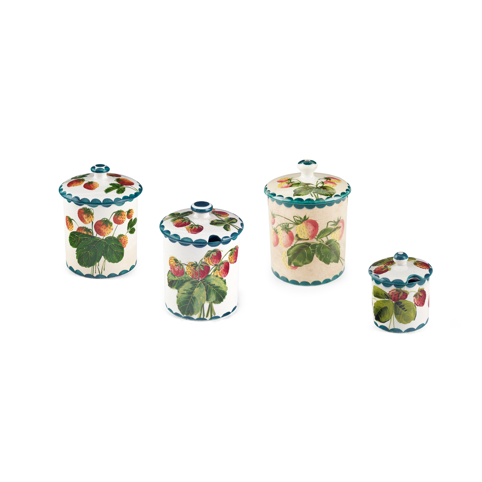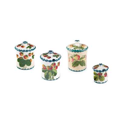 to include a LARGE 'STRAWBERRIES' PRESERVE JAR & COVER, glazed earthenware, impressed maker’s mark WEMYSS, printed Thomas Goode & Co. retailer's mark, 16cm high; a LARGE 'STRAWBERRIES' PRESERVE JAR & COVER, glazed earthenware, impressed maker's mark WEMYSS WARE/ R.H.& S., 17.5cm high; a MEDIUM 'STRAWBERRIES' PRESERVE JAR & COVER, glazed earthenware, painted and impressed maker’s mark WEMYSS, 12cm high; a SMALL 'STRAWBERRIES' PRESERVE JAR & COVER, glazed earthenware, probably painted by Christina McKinnon, painted and impressed maker’s mark WEMYSS, 7cm high (4)