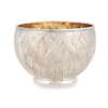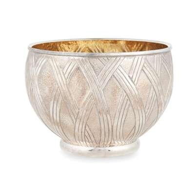 of hemi-spherical form, chased interwoven bands to a planished finish ground, gilt interior, raised on a collet foot