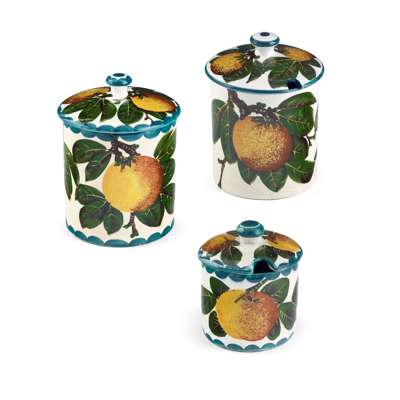 to include a LARGE 'ORANGES' PRESERVE JAR & COVER glazed earthenware, impressed maker’s mark WEMYSS, 16cm high; a MEDIUM 'ORANGES' PRESERVE JAR & COVER, glazed earthenware, impressed maker’s mark WEMYSS, 12cm high; a SMALL 'ORANGES' PRESERVE JAR & COVER, glazed earthenware, probably by Christina McKinnon, painted maker’s mark WEMYSS, 7cm high (3)
