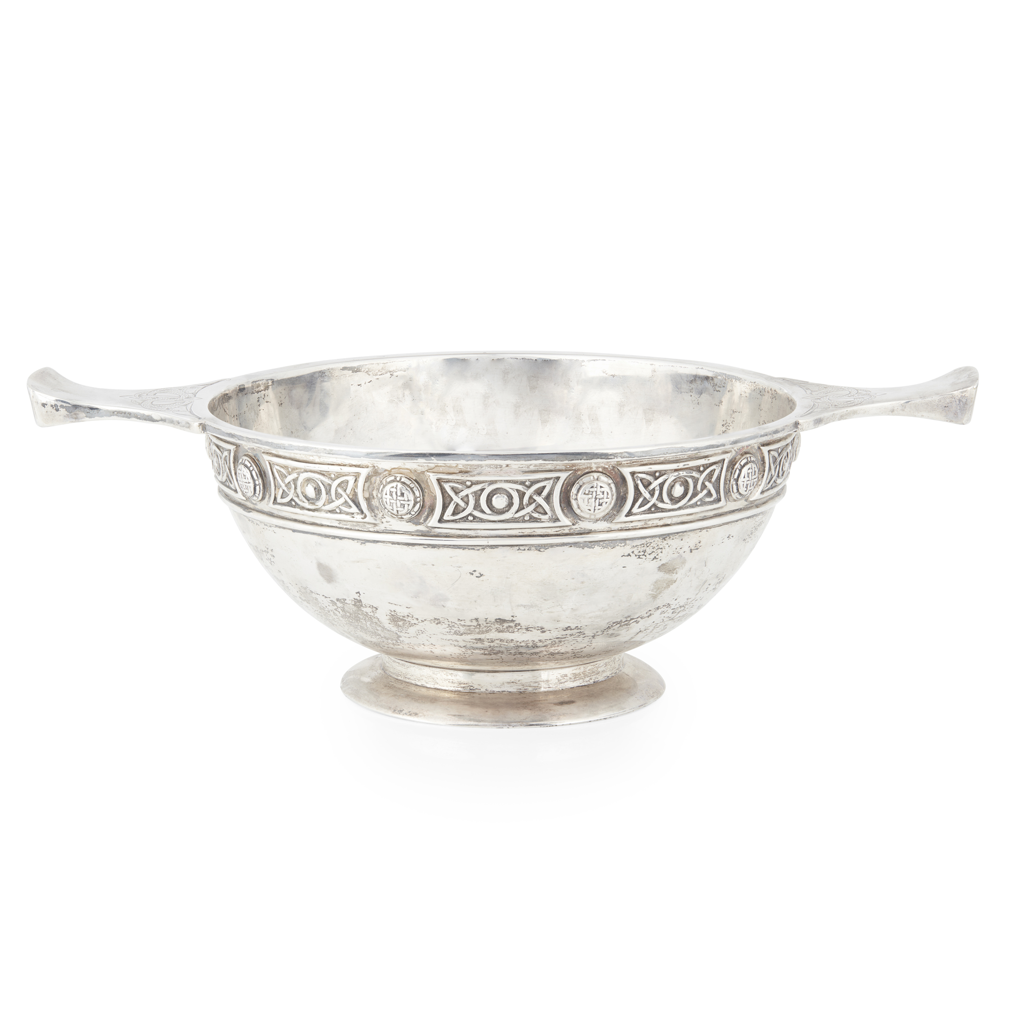 of hemispherical form, Celtic knotwork border, the lugs, each of waisted form with engraved interwoven motifs, raised on a circular foot