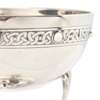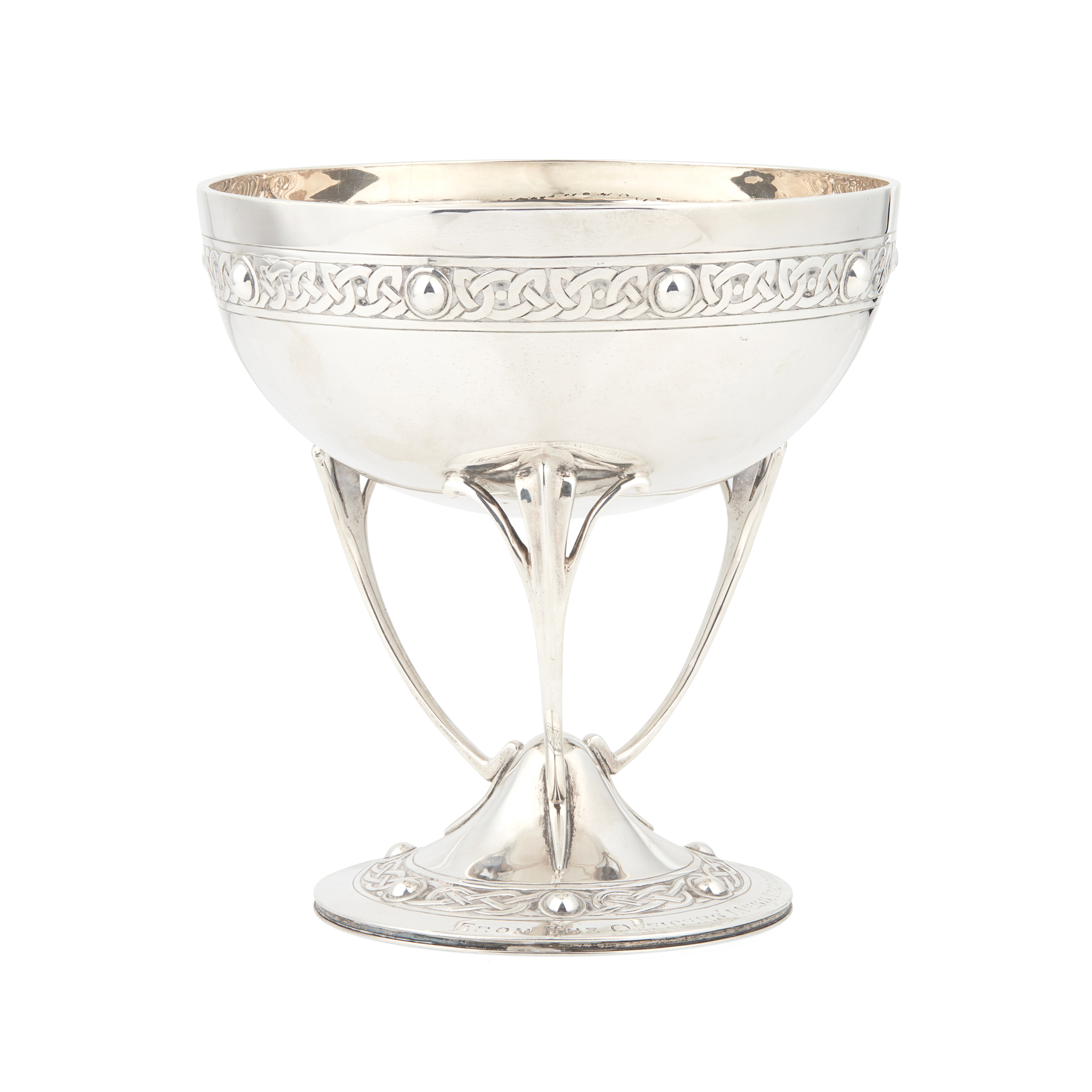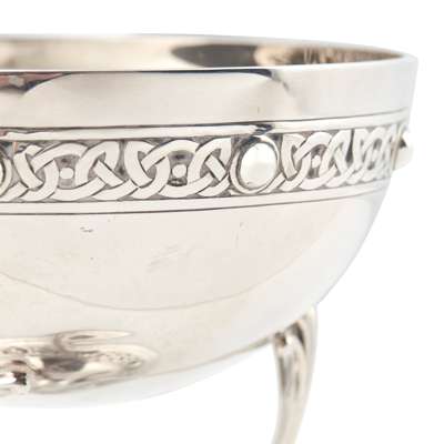 the hemispherical bowl with Celtic knotwork border and boss spacers, raised on three legs with split shoulders, to a domed circular foot, with similar Celtic knotwork border, engraved presentation engraving to foot '...1918'