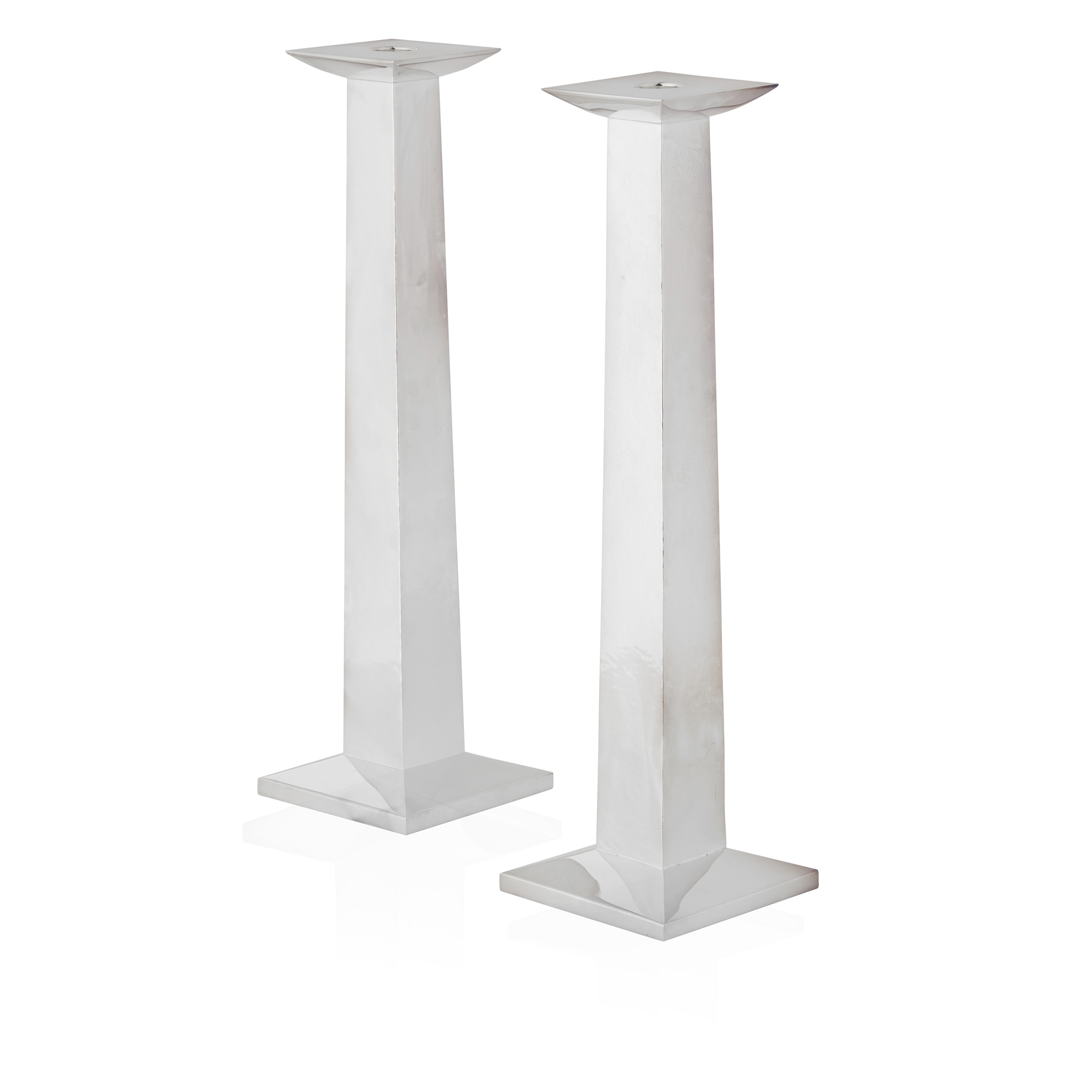 the planished stems each of tapering square column form, to polished square bases and square drip pans (2)