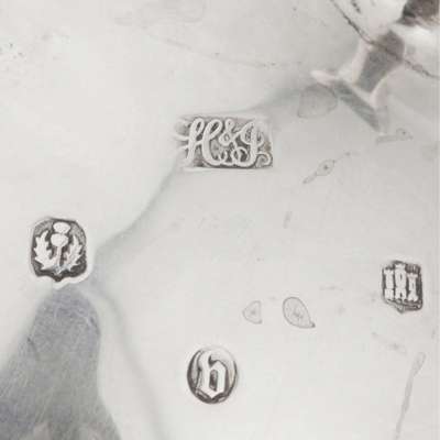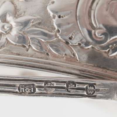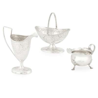 of George III navette form with chased floral and scroll borders and engraved crest within cartouche; together with a baluster cream jug with hoof and shell feet, Hamilton & Inches Edinburgh 1883 (3)