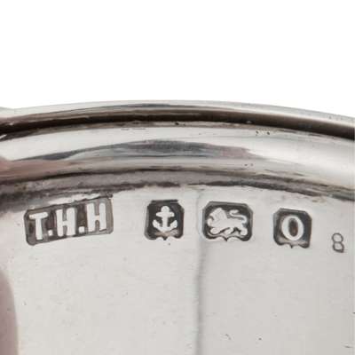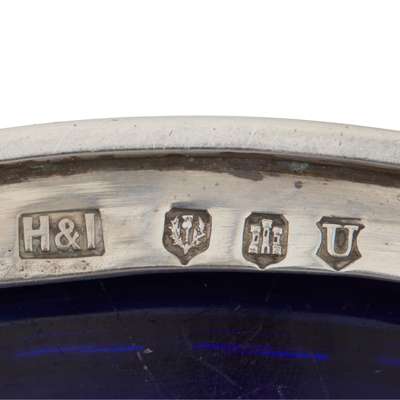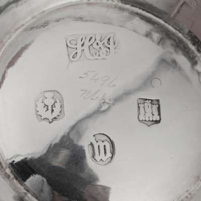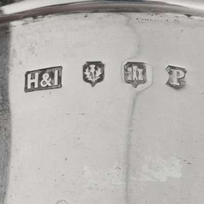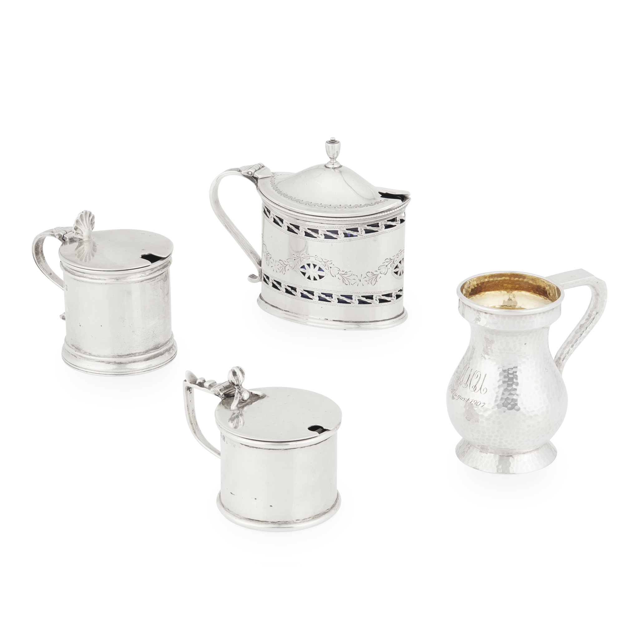formed as a miniature baluster mug with a planished finish, with engraved initials and date; together with three mustard pots all by Hamilton & Inches in the George III style (4)