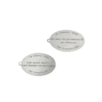 each of oval outline, dated ‘14 January 1836’, and ‘Not transferable’ the first engraved for 'LADY HARRIET STUART/ FORBES', the second engraved for 'SIR/ JOHN STUART FORBES/ BT', each with a circular bale