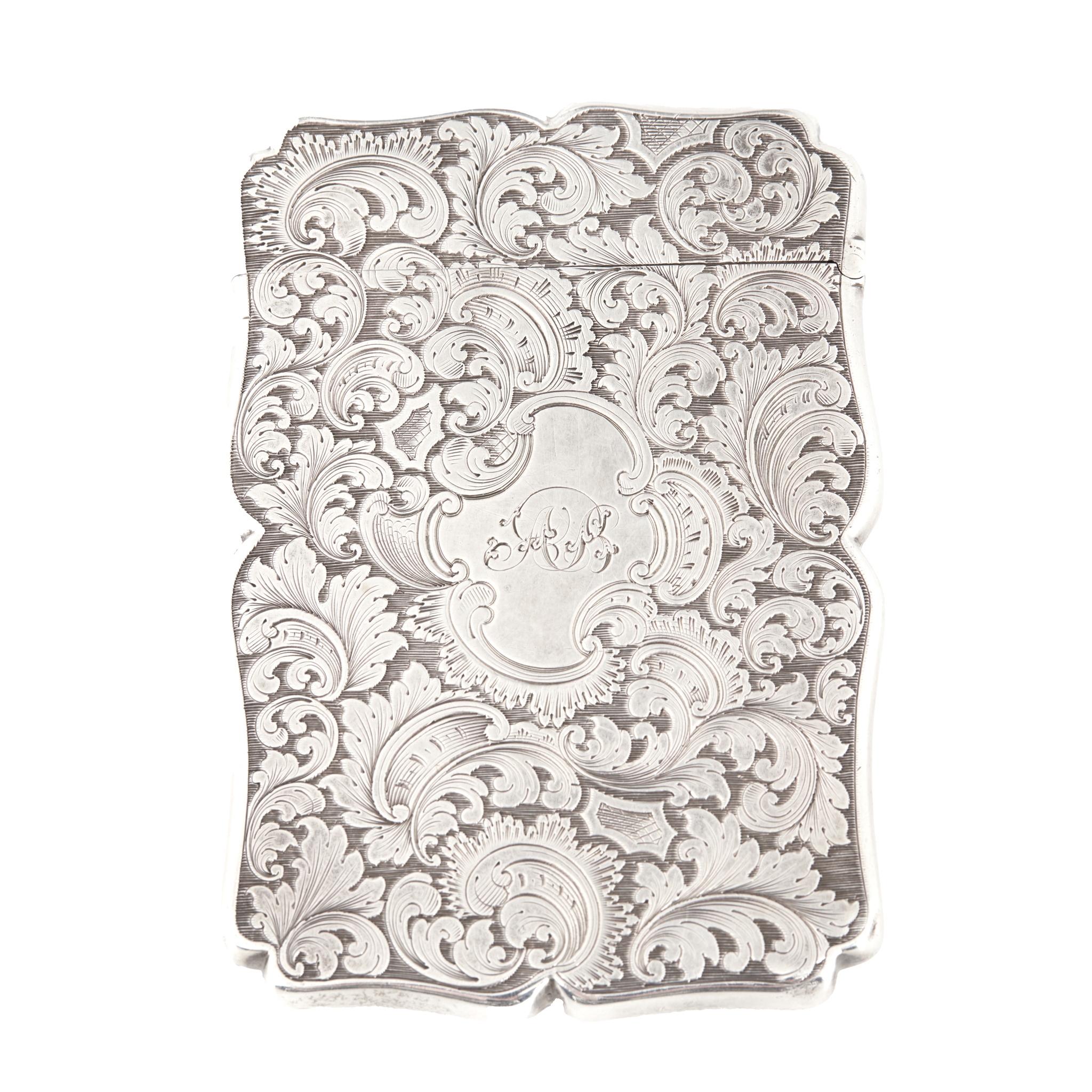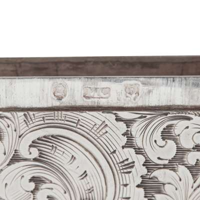 of moulded rectangular outline, engraved with a bird amidst foliated scrolls to one side, foliate scrolls to the other with engraved initials to the central cartouche