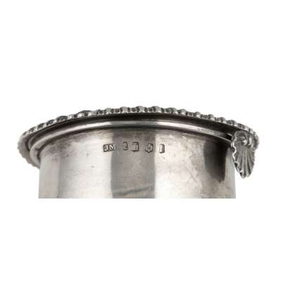 the tapered bowl with gadrooned rim and shell clip, engraved crest, the tapered spout with triple staves