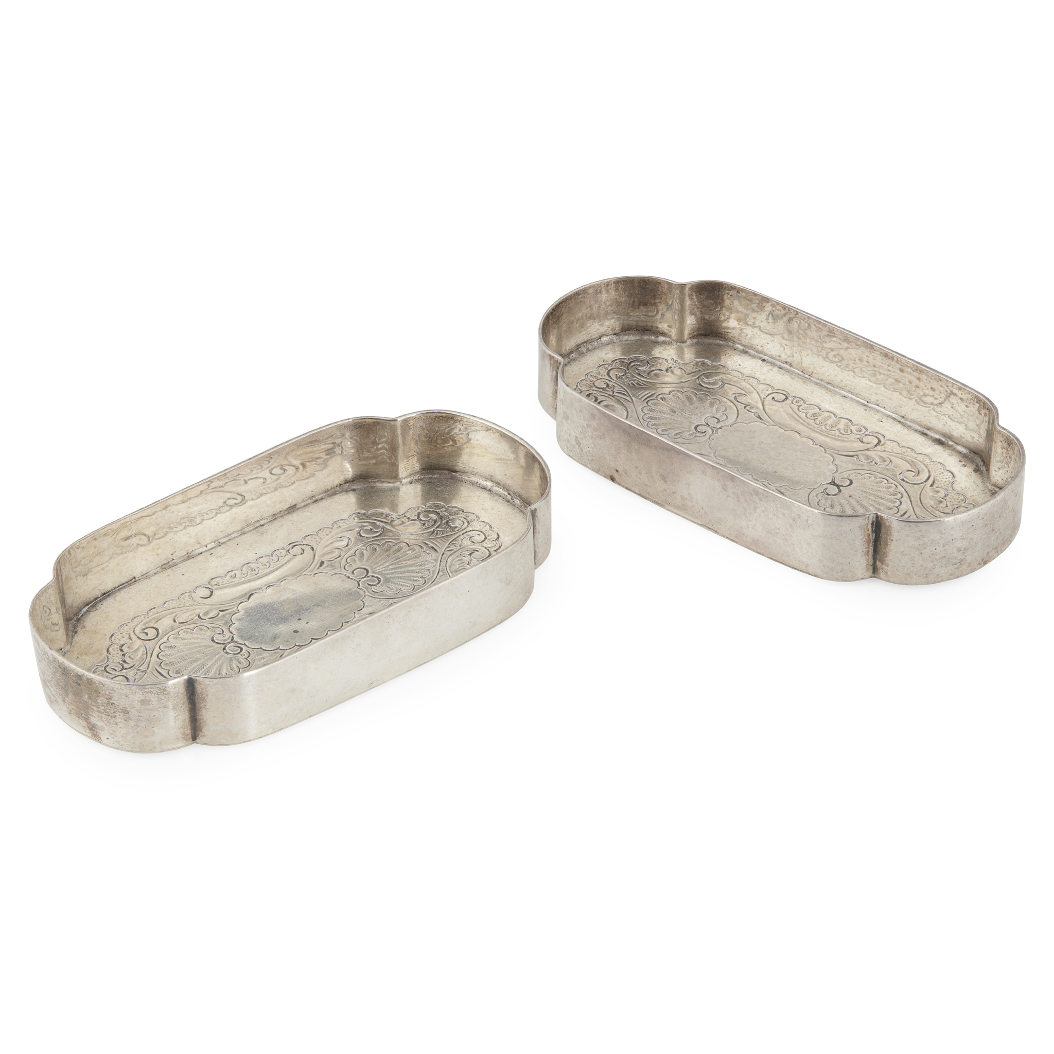 each of moulded oval outline chased shell and scroll decoration to the base (2)