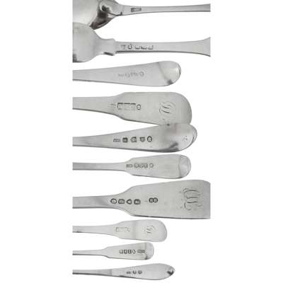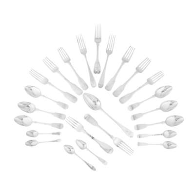 mainly Edinburgh, to include, six dessert forks, Edinburgh 1812, Fiddle pattern, italic initials engraved to reverse of terminal; two table forks, Henry Holland, London 1845, italic initials engraved to reverse of terminal; one table fork, Robert Gray & Son, Edinburgh 1815, of Fiddle and Shell variant pattern; a tablespoon, William Patrick Cunningham, Edinburgh 1795, of Old English pattern, engraved initials to terminal; pair of table forks, Alexander Zeigler, Edinburgh 1800, of Old English pattern, engraved crest and motto to terminal; six dessert spoons, John Wilkie, 1847, 1855, of Fiddle pattern, engraved italic M to terminal and a collection of six teaspoons, various patterns including Scot's Fiddle pattern (24)
