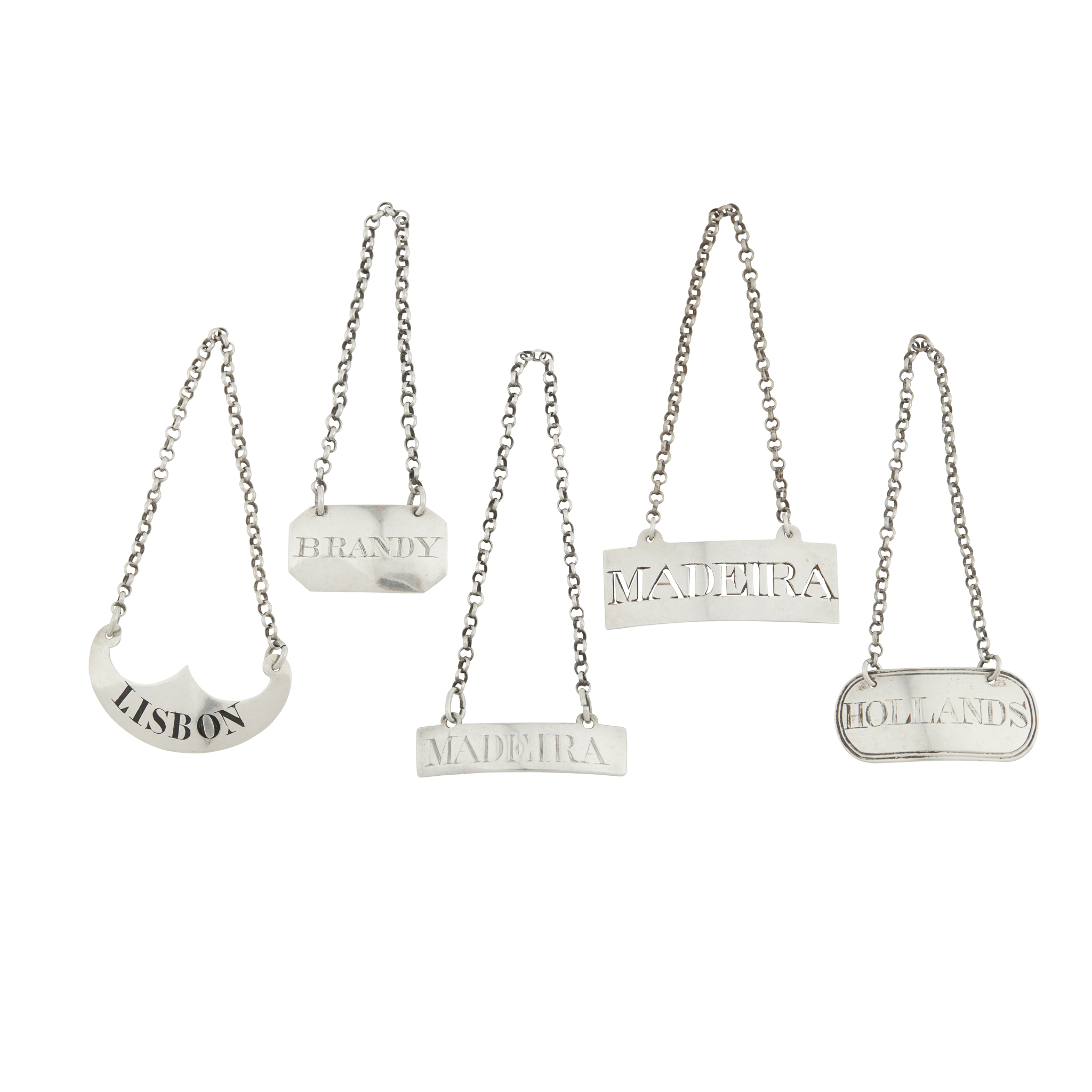 to include a wine label for “Lisbon”, Robert Gray and Son (of Glasgow), Edinburgh 1811; a wine label for “Madeira”, W&P Cunningham, Edinburgh, 1797; a spirit label for “Brandy”, W&P Cunningham, Edinburgh 1815; a wine label, “Hollands”, E Morley, London 1808/9; together with a wine label for "Madeira”, George Nangle, Dublin, c.1795 (5)
