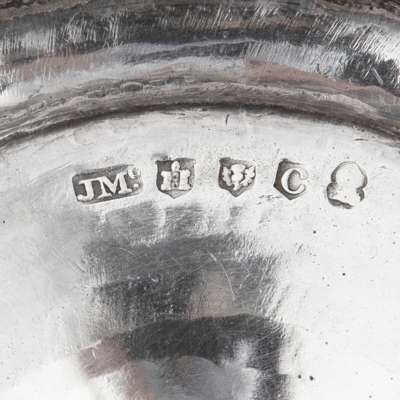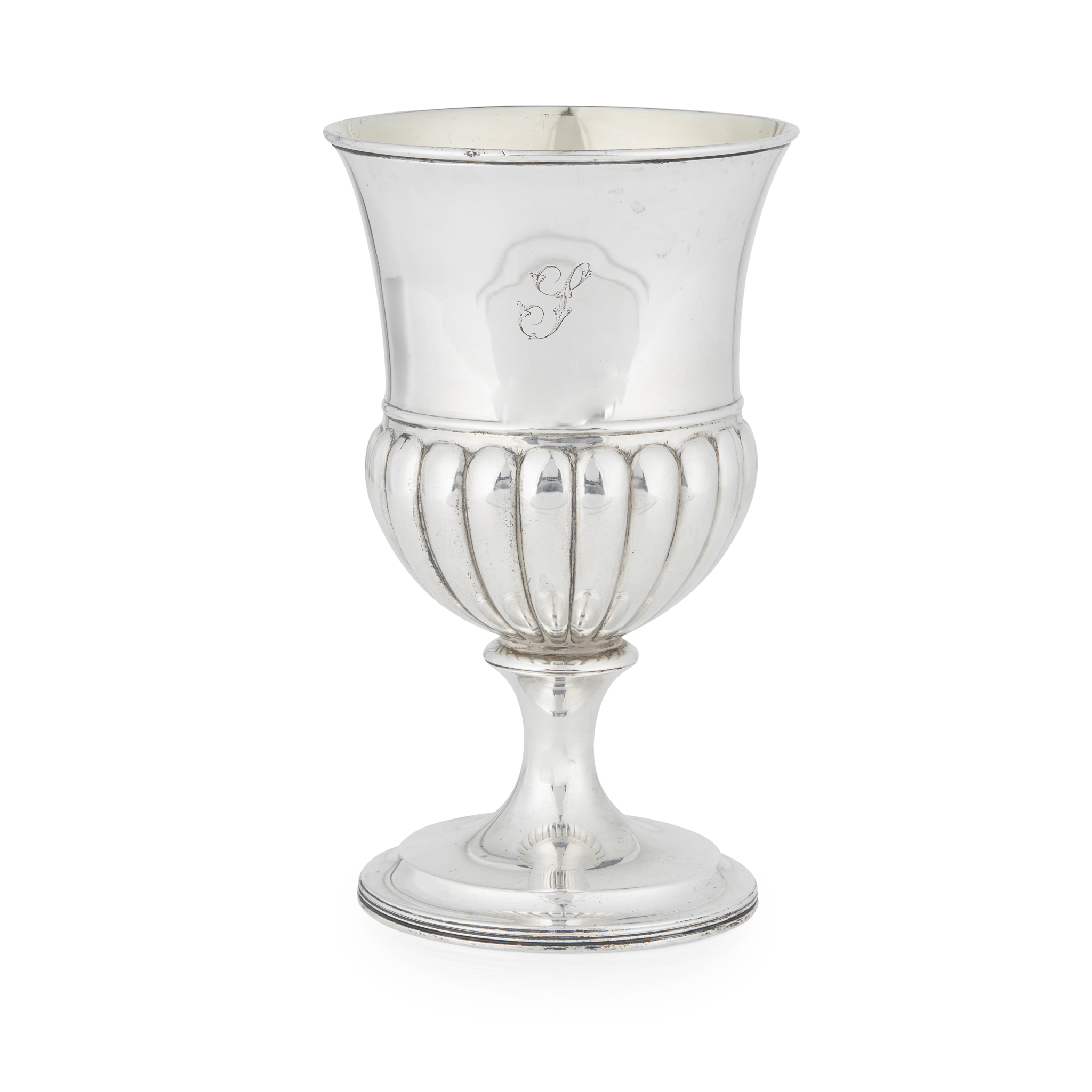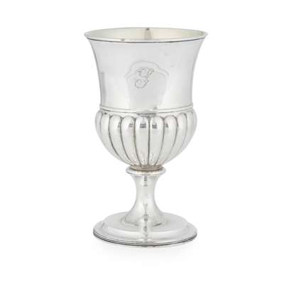 of traditional form with flared rim and fluted lower section, engraved with foliate initial S, raised on a knopped stem and spreading foot