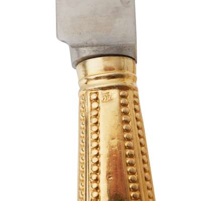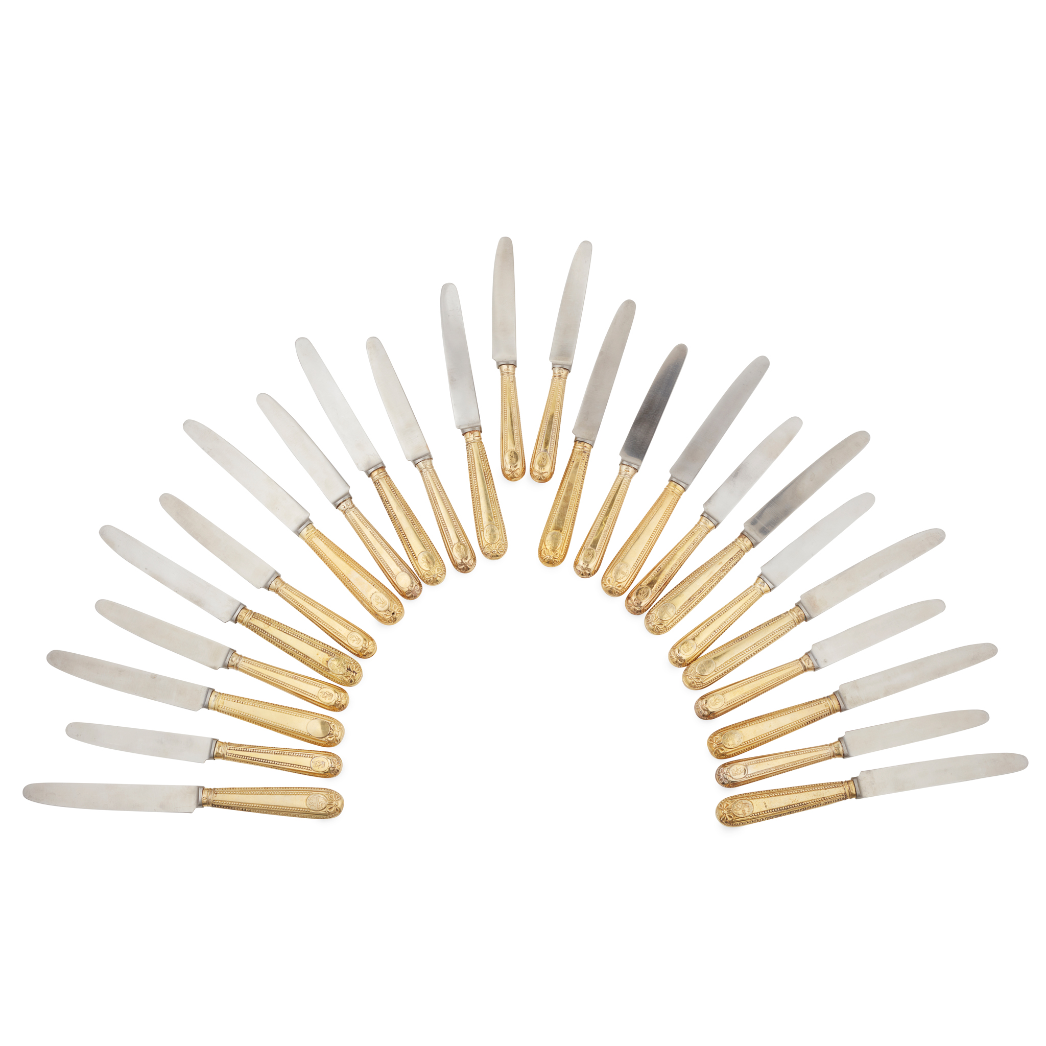 A RARE SUITE OF TWENTY-FOUR GEORGE III SCOTTISH SILVER GILT TABLE AND DESSERT KNIVES