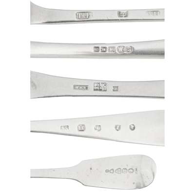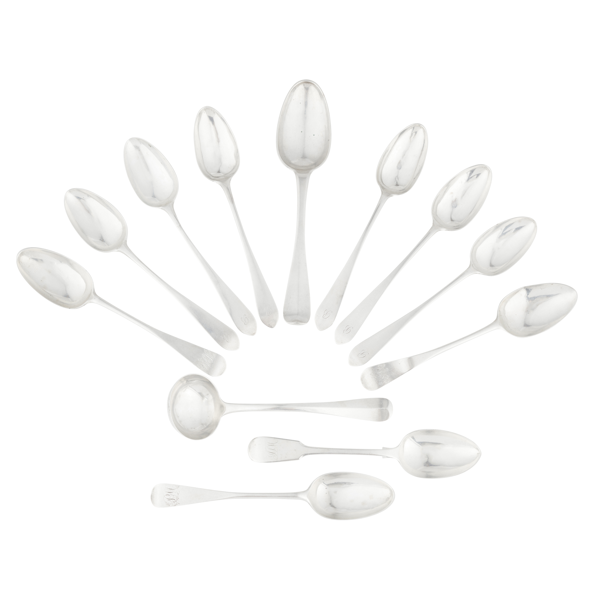 of Celtic point pattern, italic B engraved to terminal; together with a Fiddle pattern tablespoon, Newcastle, 1849, modern sauce ladle, London, of Hanoverian pattern; A German/ Polish spoon with Loth mark for .812 purity; three Scottish Provincial tablespoons, Thomas Hamilton & Co. Glasgow circa 1780s