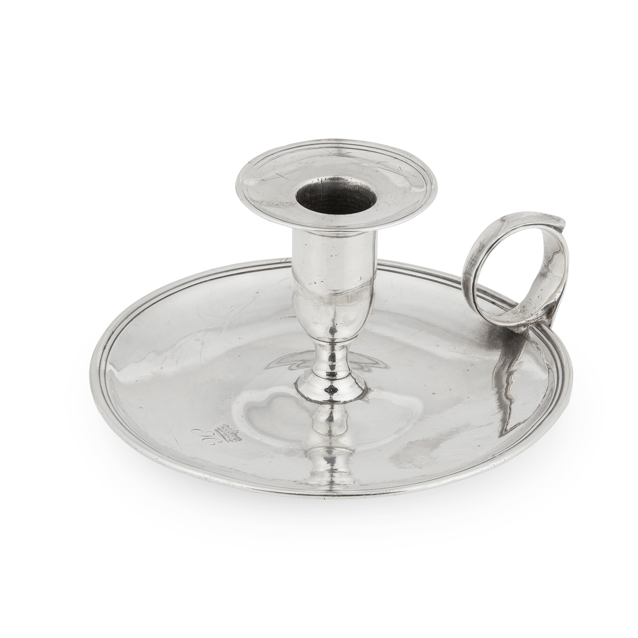 the central sconce set to a simple dished base with threaded detail, engraved H with a Viscount's coronet, the C-scroll handle with plain thumb piece