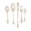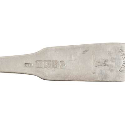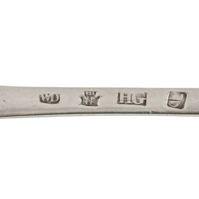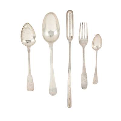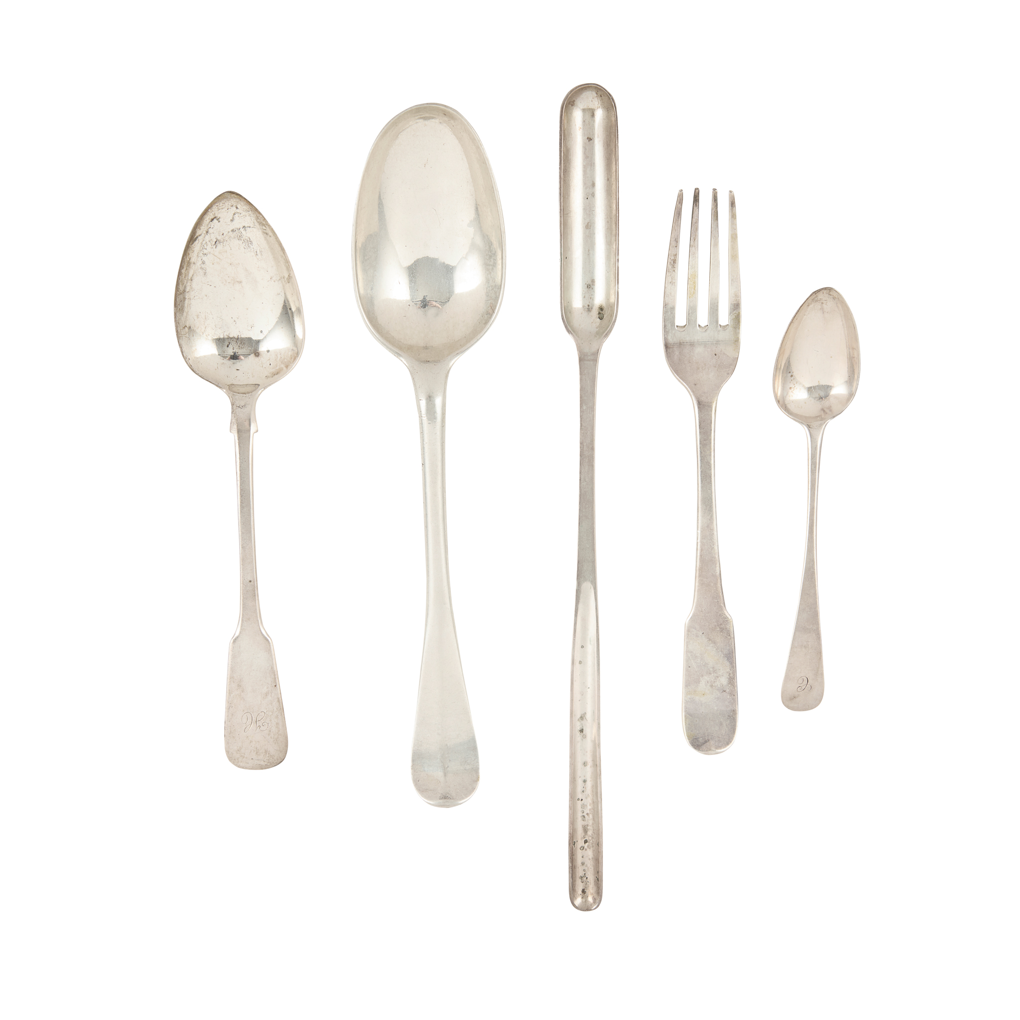 to include, a pair of tablespoons, William Dempster, Edinburgh 1753, of Hanoverian pattern, engraved initials to reverse of terminal, and another slightly smaller with rubbed marks; a set of seven dessert forks, Alexander Henderson, Edinburgh 1811, of Fiddle pattern, crest and motto engraved to reverse of terminal; a set of six dessert spoons, G.R.,Glasgow 1826, of Fiddle pattern, engraved initial to terminal, eight teaspoons, Robert Keay of Perth, of Old English pattern, engraved initial to terminal; together with a marrow scoop William Robertson, Edinburgh, engraved crest to bowl