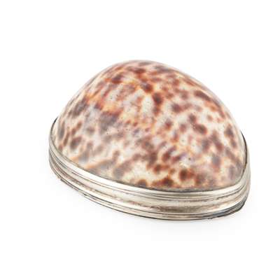 AN UNSUAL GEORGE II SILVER MOUNTED COWRIE SHELL SNUFF BOX