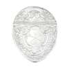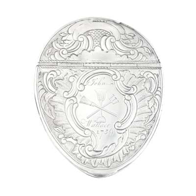 the polished cowrie shell mounted with plain rim, the hinged cover with chased floral scroll decoration, the central cartouche engraved ‘John Wallace 1759’