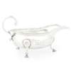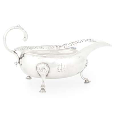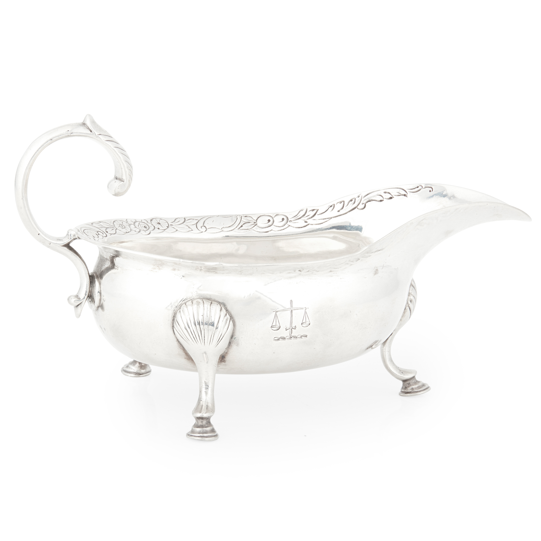 of traditional form, the everted rim chased with floral decoration, acanthus clasped handle, crest engraved to the body, raised on three hoof feet