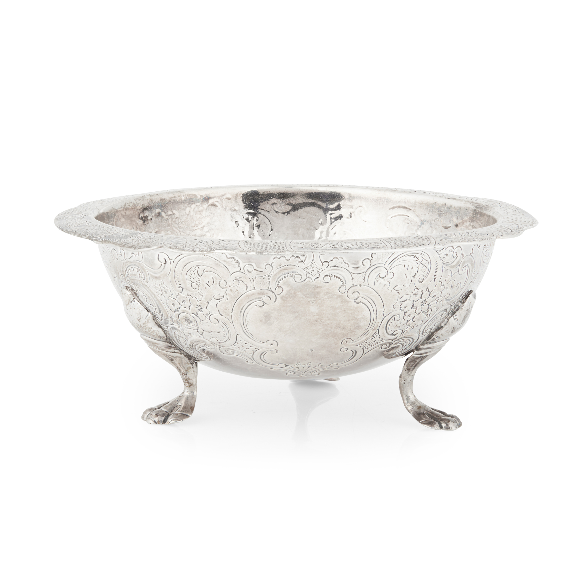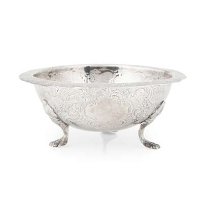 Assay Master, Dougal Ged, of slight baluster form, chased scroll and floral border to body, the everted rim with similar chased detail, raised on three scroll and paw feet