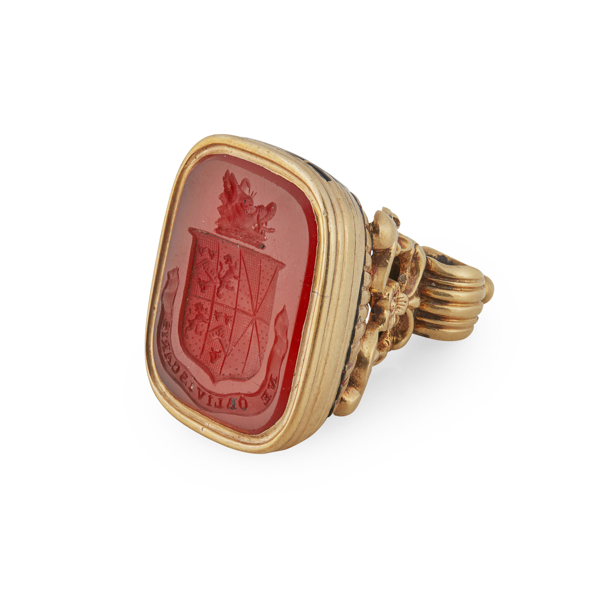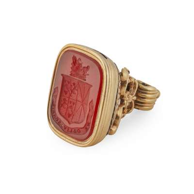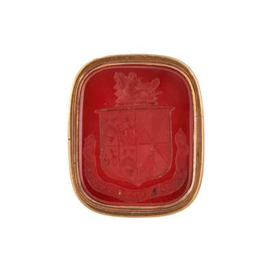 the fluted and scrolling mount enclosing a rounded rectangular chalcedony matrix, finely engraved with arms, crest and motto ‘NE OBLIVISCARIS’ for Clan Campbell
