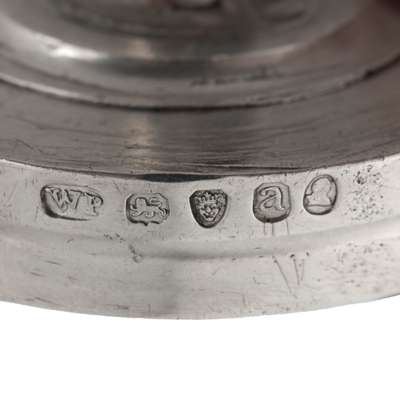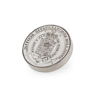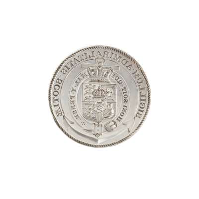 of circular outline, bearing the engraved crest for the Lord High Admiral of Scotland, in a border modelled as a garter with anchor to a further border with the engraved Latin motto ‘SIGILLUM ADMIRALITATUS SCOTIAE’