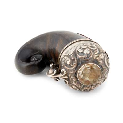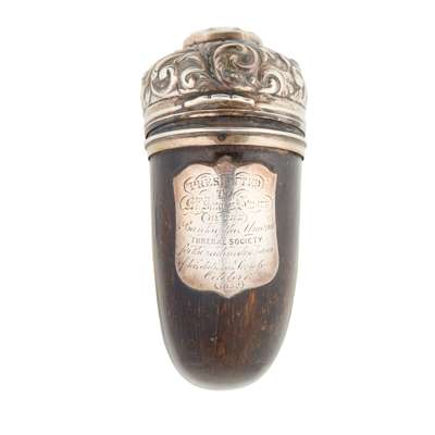 the large well coiled cow horn with applied shield cartouche inscribed ‘presented to Mr James Stewart by the Bank of the Minend (?)…. 1825’, the domed cover with chased foliate scrolls surrounding a facetted paste to centre, with large ball and claw hinge
