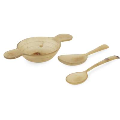 of traditional twin handled form; together with a bone teaspoon with applied shield and another jam spoon