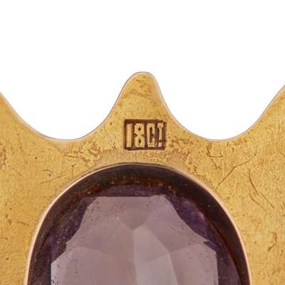 the upper hemi-spherical section collet set with an oval citrine in an engraved border, flanked to either side with alternating jasper and bloodstone lozenges, the lower half of moulded outline, engraved with foliate decoration, collet set with an oval amethyst and flanked to either side with an oval citrine, engraved to the reverse, G.W.B, stamped 18CT with brooch fitting and safety chain